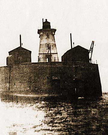 The 1878 frame tower and duplicate fog signal buildings installed on the pier in 1882