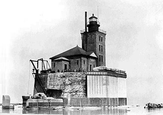 The Port Austin Reef Light in 1933 when the crib was being faced with concrete.