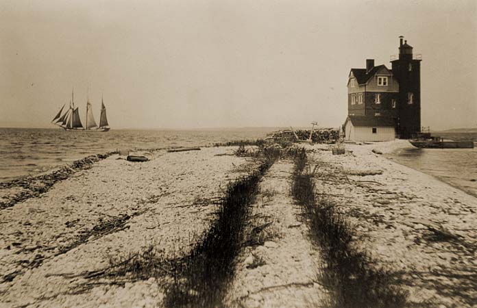 A schooner passes the Round Island Lighthouse at the turn of the twentieth century