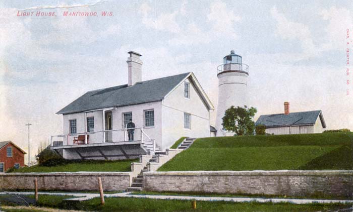 This turn of the century postcard is the only image of the old Manitowoc lighthouse that we have thus far been able to find. Note the tower's design similarity the the structure still standing at Presque Isle on Lake Huron, and is typical of towers erected around the Great Lakes under the Pleasonton administration Antique postcard from the Terry Pepper Great Lakes collection |