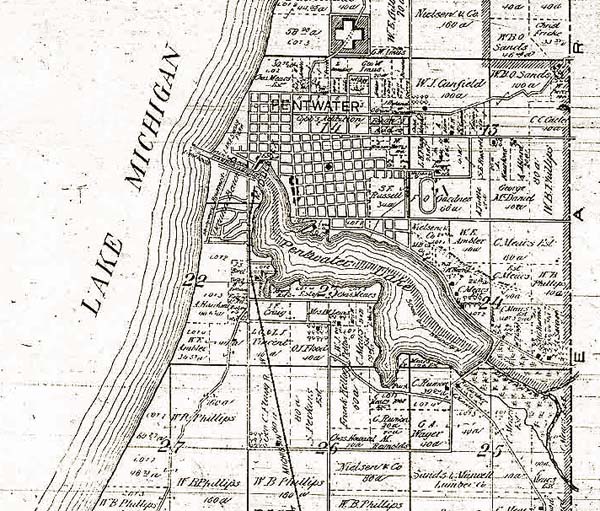 1890 map of Oceana County, showing Pentwater Lake and the location of the channel cut into Lake Michigan. From the Terry Pepper Great Lakes collection