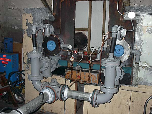 The twin F-2-T diaphones which were relocated from Kewaunee in 1995 and installed in the South Breakwater fog signal building. These diaphones are a virtual duplicate of these originally installed in Duluth in 1923 Photograph courtesy of Jeff Laser 2001. Appears with permission |