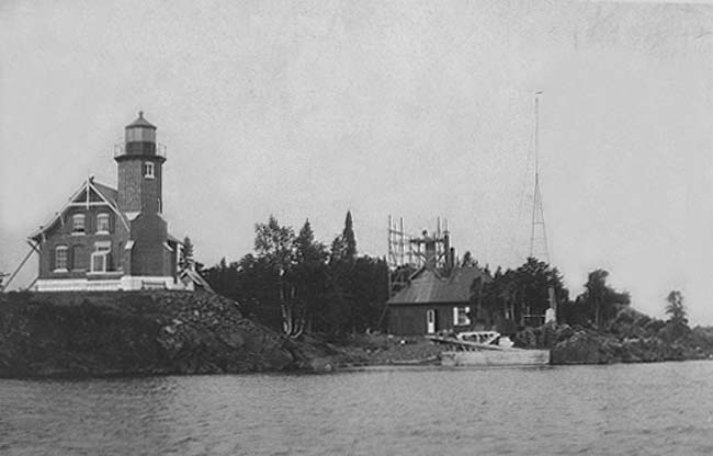 Eagle Harbor Light in 1905. Note the erection of the new brick chimney on the fog signal building Photograph courtesy of the Bill Boutwell collection. Appears with permission
